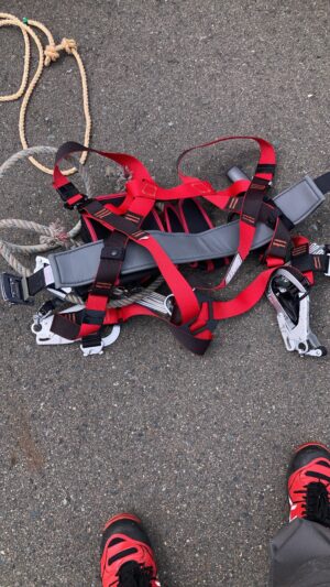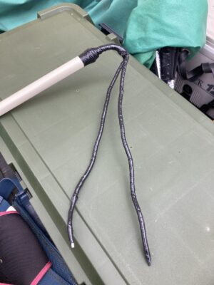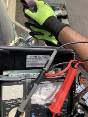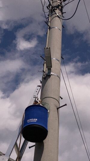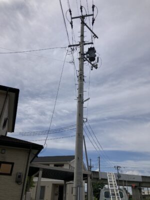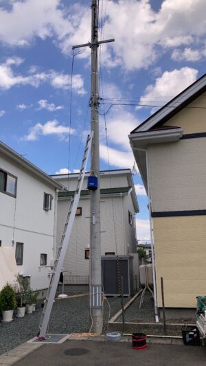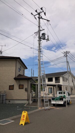 電柱の高い位置から防犯灯用の電源を下ろしてきます
